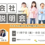 2025年10月1日 / 最終更新日時 : 2025年10月1日 kodoken-website イベント情報会社説明会2025のご案内 弊社は、子ども支援の領域で新たな価値とサービスを提供するスタートアップ企業です。今年創業3期目を迎えたばかりの若い会社になりますが、行政機関と連携した不適切保育対策に係る事業、保育所等の児童福祉施設の職員向けの研修事業、 […]